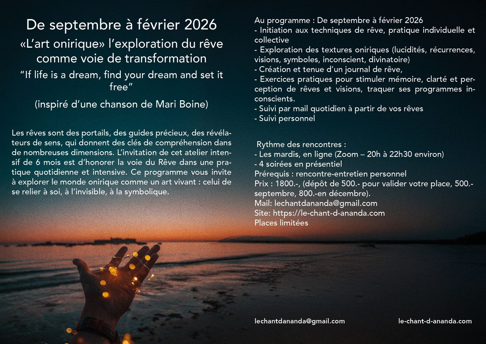 Ce programme vous invite à explorer le monde onirique comme un art vivant: celui de se relier à soi, à l’invisible, à la symbolique.