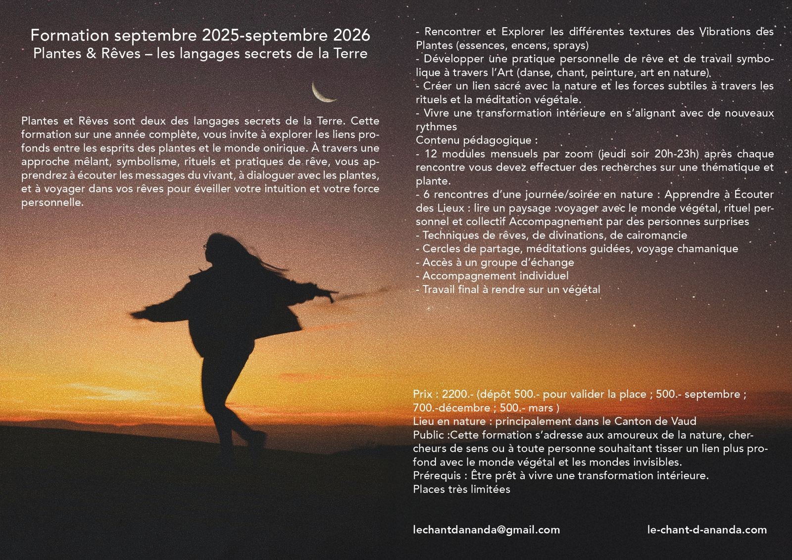 Plantes et Rêves sont deux des langages secrets de la Terre. Cette formation sur une année complète vous invite à explorer les liens profonds entre les esprits des plantes et le monde onirique. À travers une approche mêlant symbolisme, rituels et pratiques de rêve, vous apprendrez à écouter les messages du vivant, à dialoguer avec les plantes et à voyager dans vos rêves pour éveiller votre intuition et votre force personnelle.