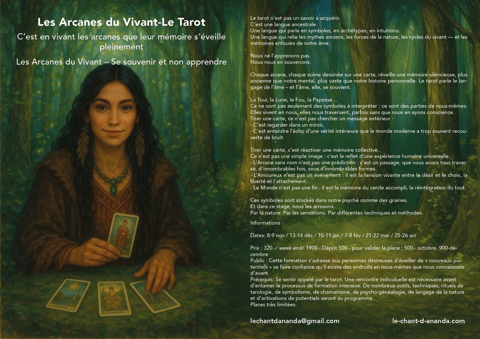 Se sentir appelé·e par le tarot. Une rencontre individuelle est nécessaire avant d’entamer le processus de formation intensive. De nombreux outils, techniques, rituels de tarologie, de symbolisme, de chamanisme, de psycho-généalogie, de langage de la nature et d’activations de potentiels seront au programme.